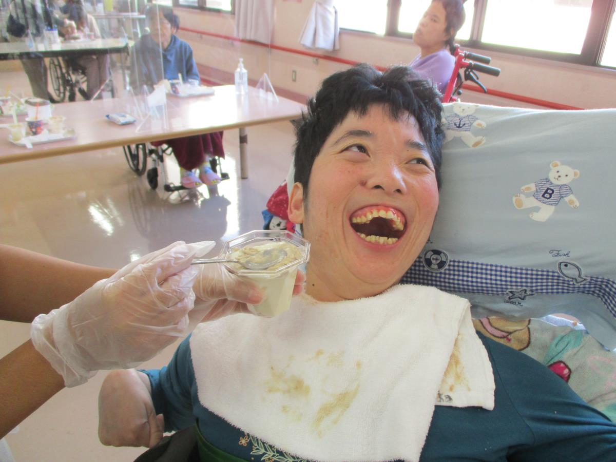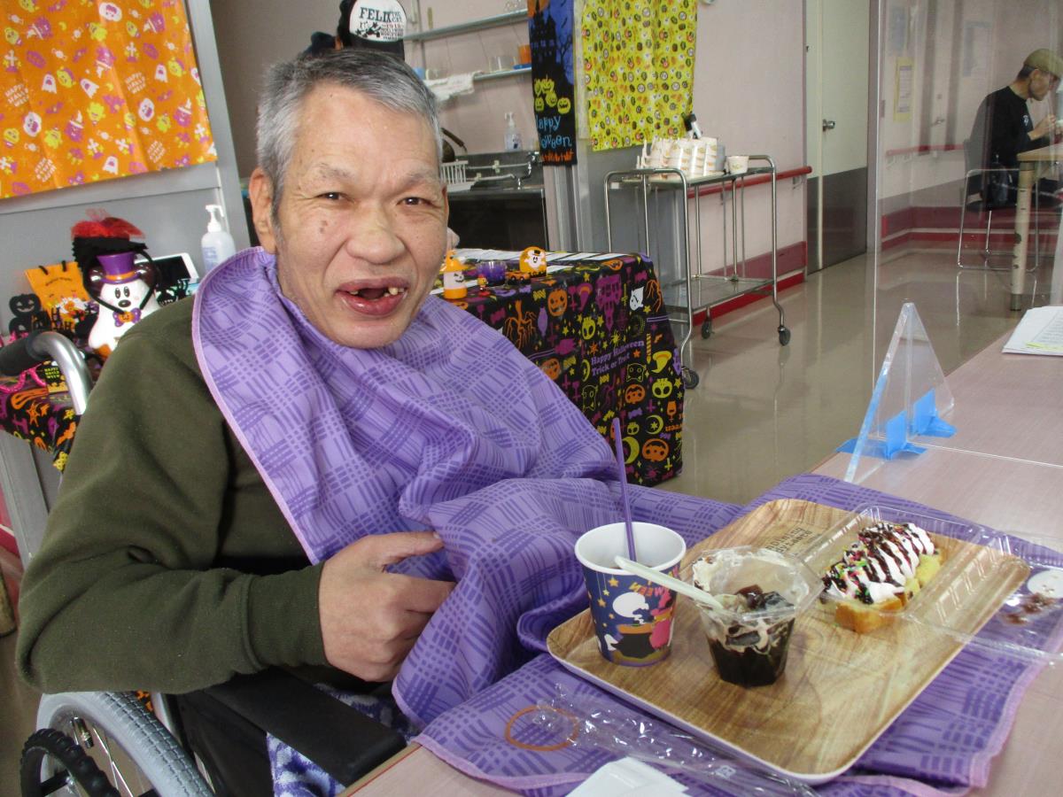 今日の献立は「ハロウィンメニュー」でした。利用者の食事形態に合わせたハロウィンメニューが提供され、皆さんの胃袋を満たしました。