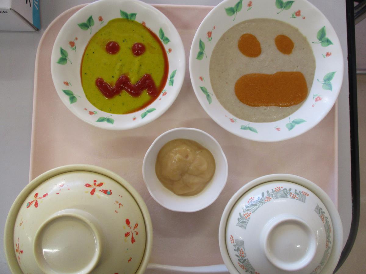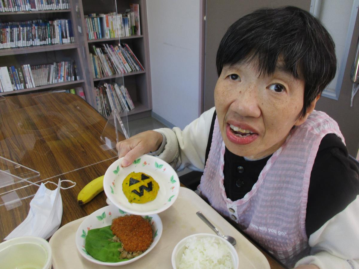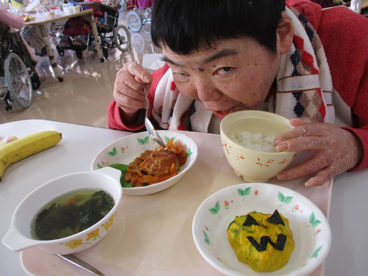 今日の献立は「ハロウィンメニュー」でした。利用者の食事形態に合わせたハロウィンメニューが提供され、皆さんの胃袋を満たしました。