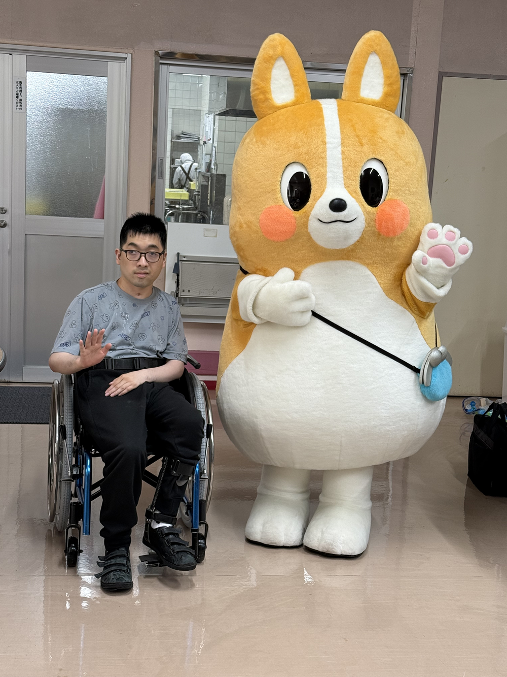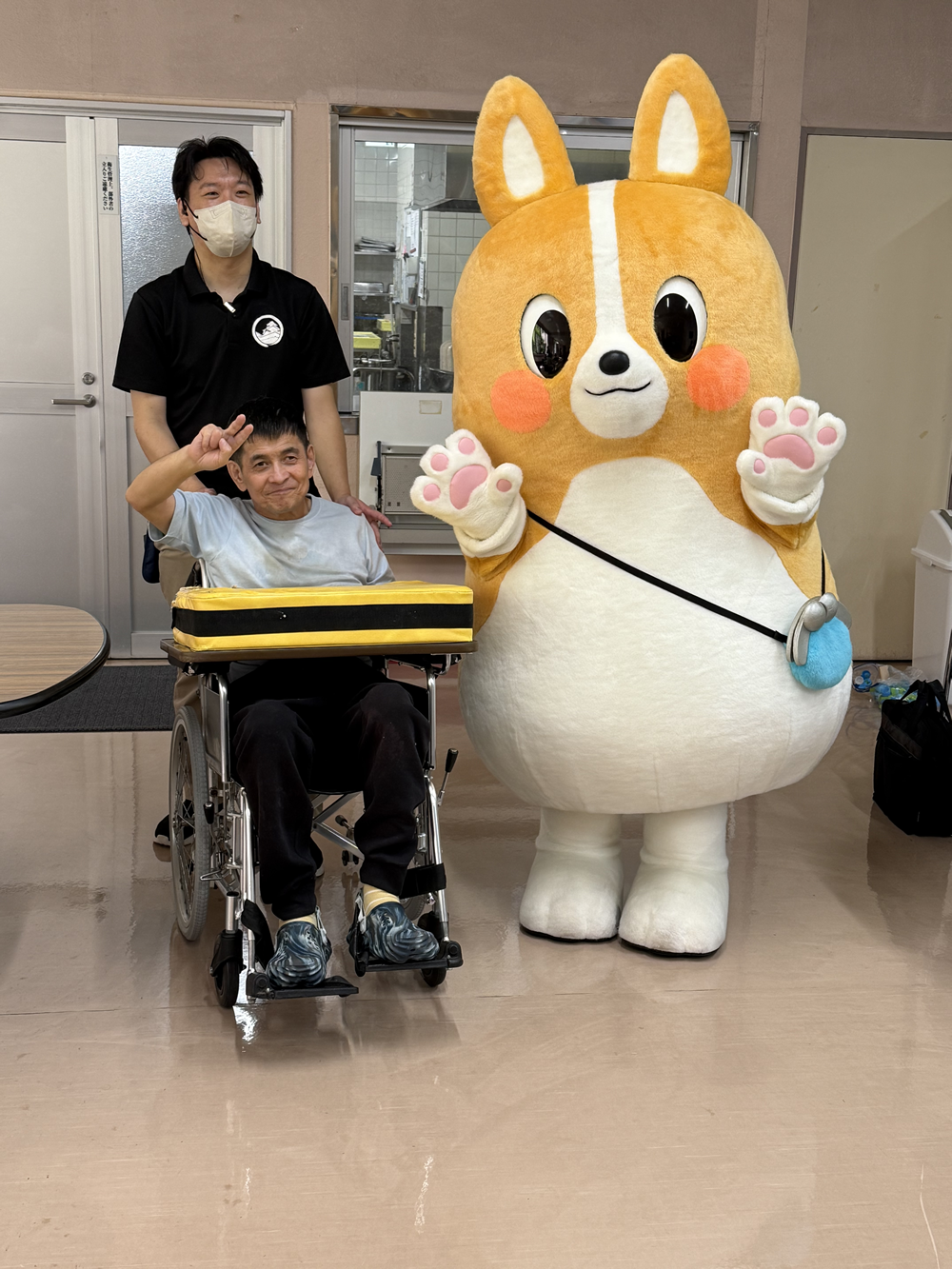 フォローアップと一緒にマスコットキャラクターの「ちばコーギ君」も来苑し、利用者の方と一緒に記念撮影を行ないました。